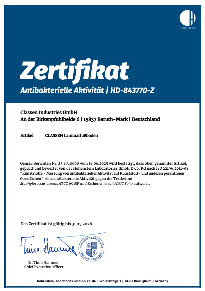 подтверждено, что ламинат Classen обладает антибактериальной активностью и подавляет рост бактерий