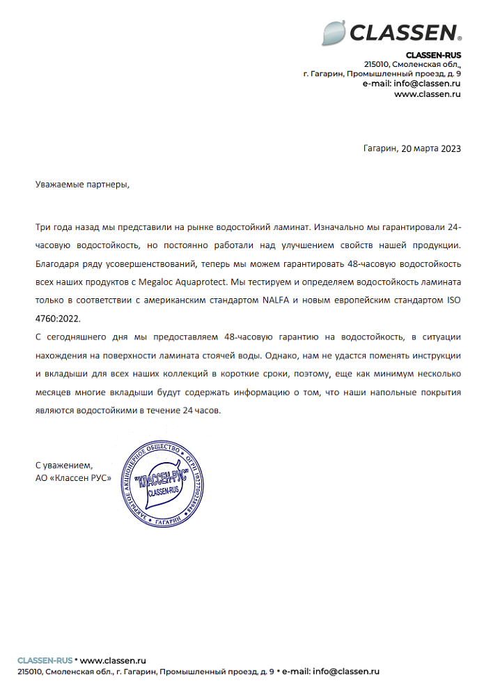 документ подтверждает, что производитель Classen дает 48ч гарантирует 48-часовую водостойкость всех наших продуктов с Megaloc Aquaprotect